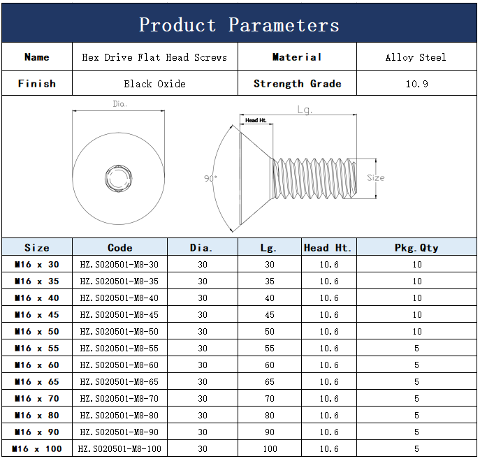 Name Hex Drive Flat Head Screws Material Alloy Steel Size M16 Finish Black Oxide Strength Grade Grade 10.9