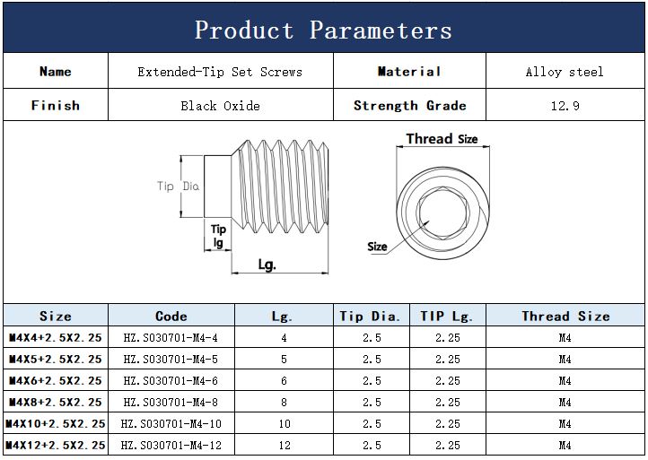 Name Extended-Tip Set Screws Material Alloy Steel Size M4 Finish Black-Oxide Strength Grade Grade 12.9