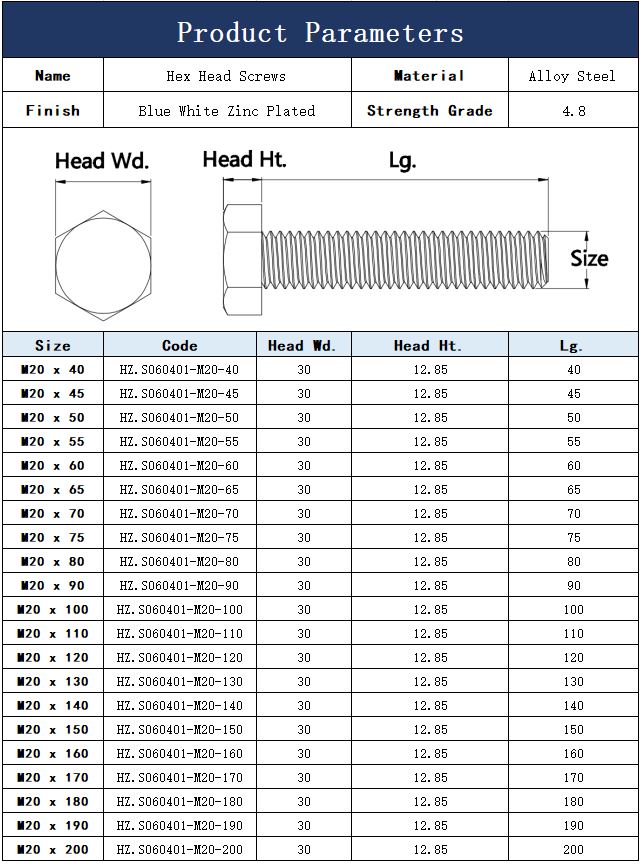 Name Hex Head Screws Material Alloy Steel Size M20 Finish Blue White Zinc Plated Strength Grade Grade 4.8