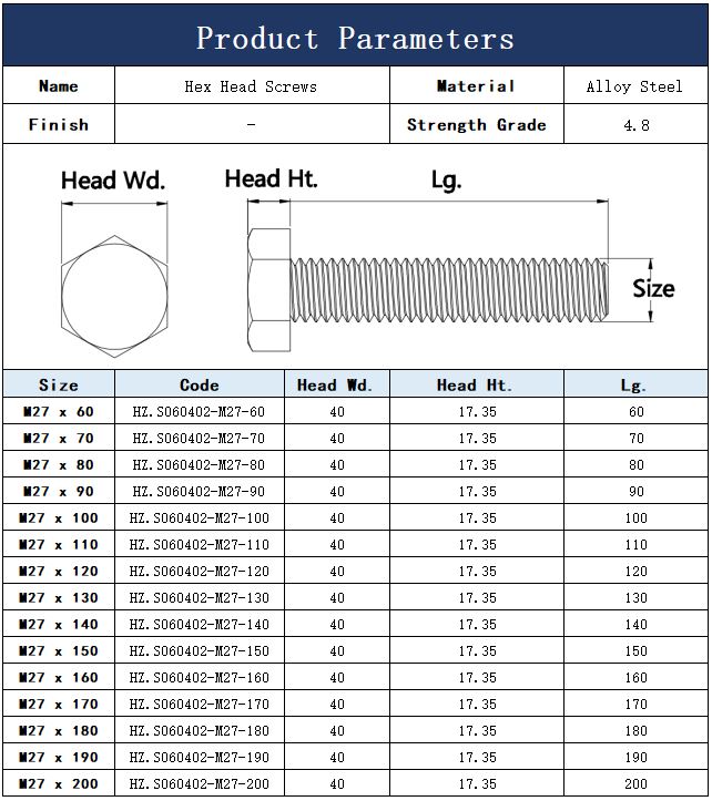 DIN933 Grade 4.8 M27 Alloy Steel Hex Head Bolts 分类: Alloy Steel, Hex Head Bolts Description Product Inquiry NameHex Head ScrewsMaterialAlloy SteelSizeM27Finish–Strength GradeGrade 4.8"" 1 NameEmailProductQuantityYour Message0 / SendPreviousNextShare This Tweet Share Plus one Share 相关产品 M10 304 Stainless Steel Serrated-Flange Hex Head Bolts Grade 4.8 M10 Zinc Plated Flanged Hex Head Bolts M8 304 Stainless Steel Extra-Wide Serrated-Flange Hex Head Bolts Grade 10.9 M10 Alloy Steel Serrated-Flange Hex Head Bolts