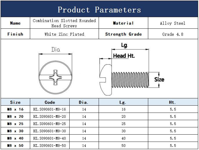 Grade 4.8 M8 White Zinc Plated Combination Slotted Rounded Head Screws