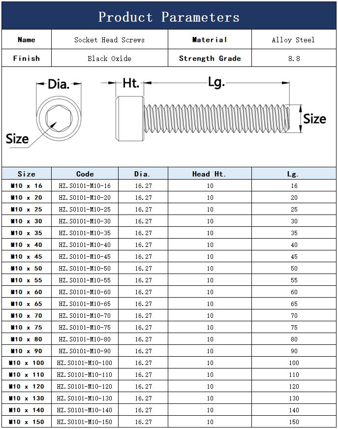 Name Socket Head Screws Material Alloy Steel Size M10 Finish Black-Oxide Strength Grade Grade 8.8