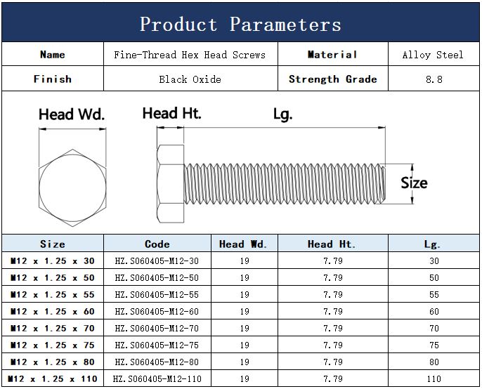 Name Fine-Thread Hex Head Screws Material Alloy Steel Size M12 Finish Black oxide Strength Grade Grade 8.8