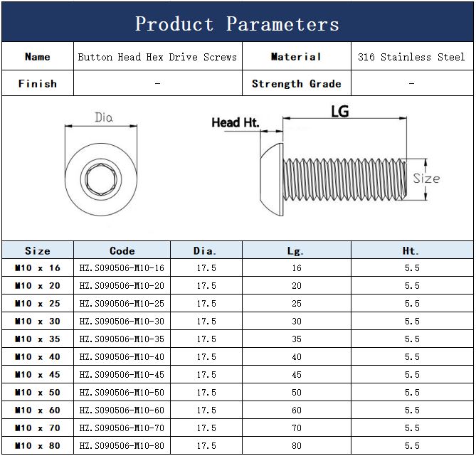 M10 316 Stainless Steel Button Head Hex Drive Screws