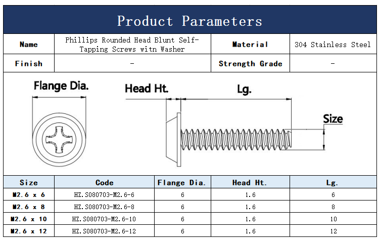Name Phillips Rounded Head Blunt Self-Tapping Screws with Washer Material 304 Stainless Steel Size M2.6