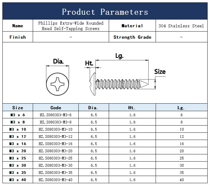M3 304 Stainless Steel Phillips Extra-Wide Rounded Head Self-Tapping Screws