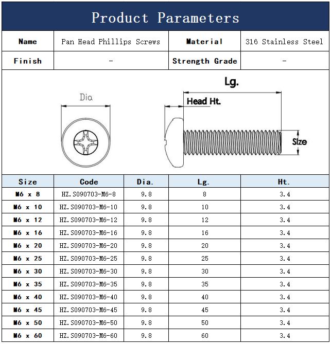 M6 316 Stainless Steel Pan Head Phillips Screws
