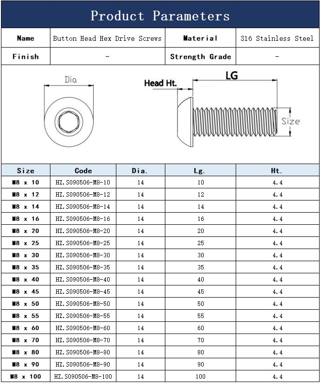 M8 316 Stainless Steel Button Head Hex Drive Screws